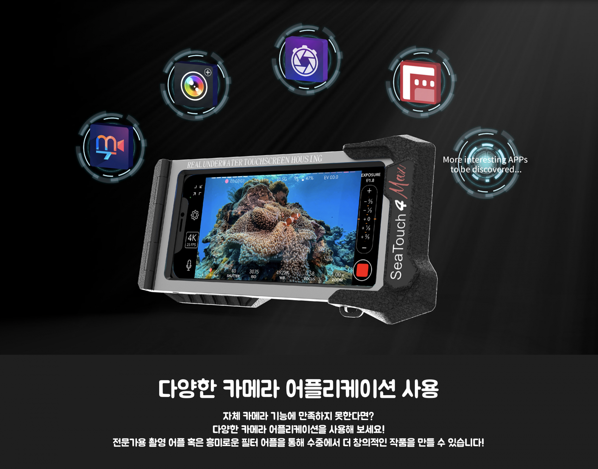 - 기존에 갖고 있는 스마트폰을 수중 카메라 하우징의 모니터로 활용 가능 (SeaLink + SeaTouch 하우징 + Expansion Clamp 필요)