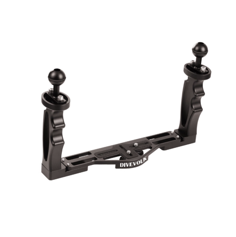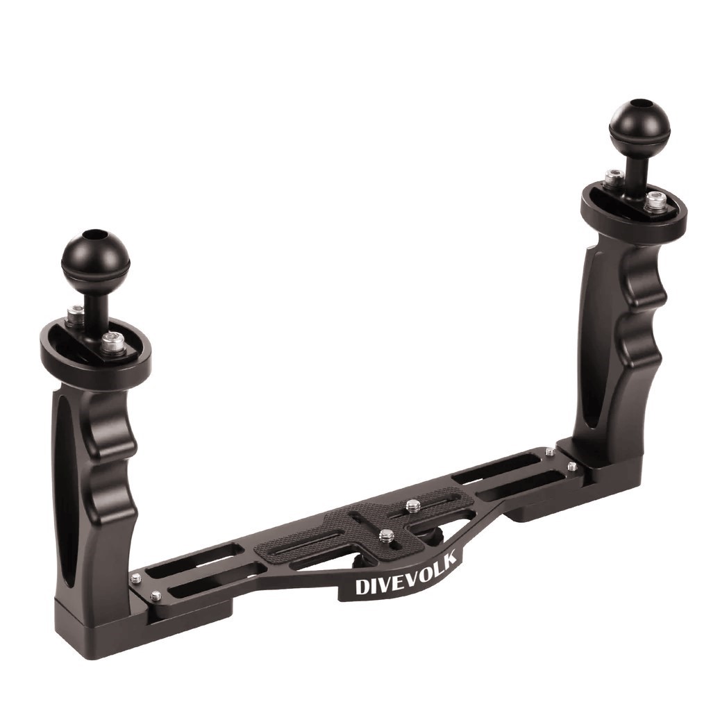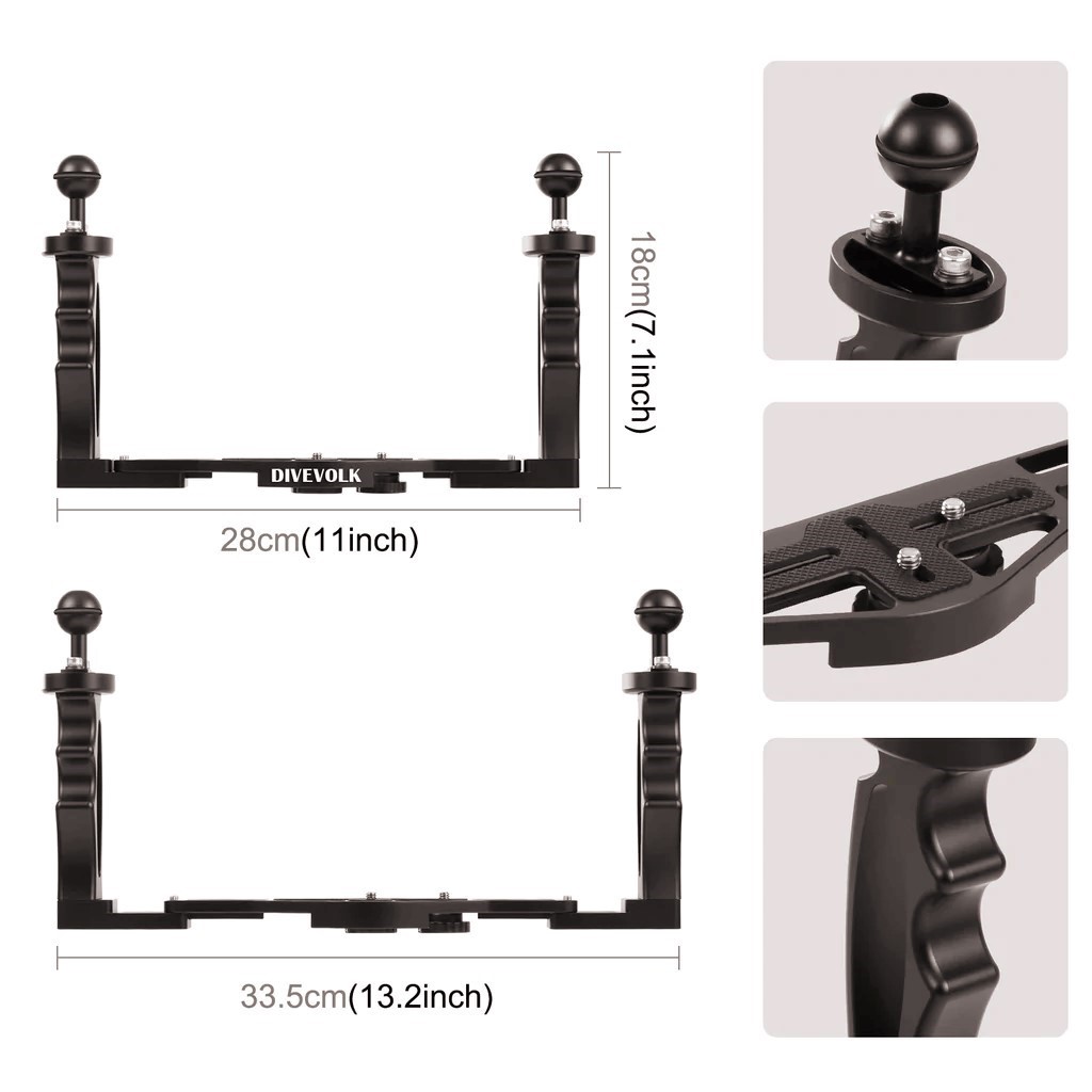 - DIVEVOLK U/W 카메라 트레이는 내구성이 뛰어나며, 알루미늄 플레이트와 고무 손잡이로 제작되며, 1/4개의 나사 2pcs 제공.