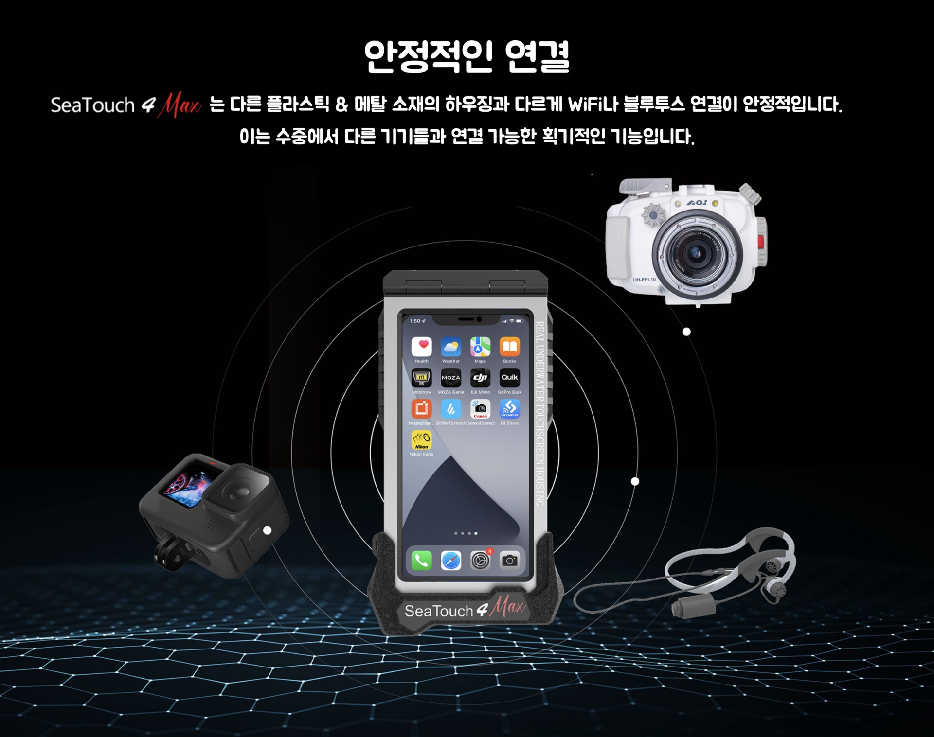 - 기존에 갖고 있는 스마트폰을 수중 카메라 하우징의 모니터로 활용 가능 (SeaLink + SeaTouch 하우징 + Expansion Clamp 필요)