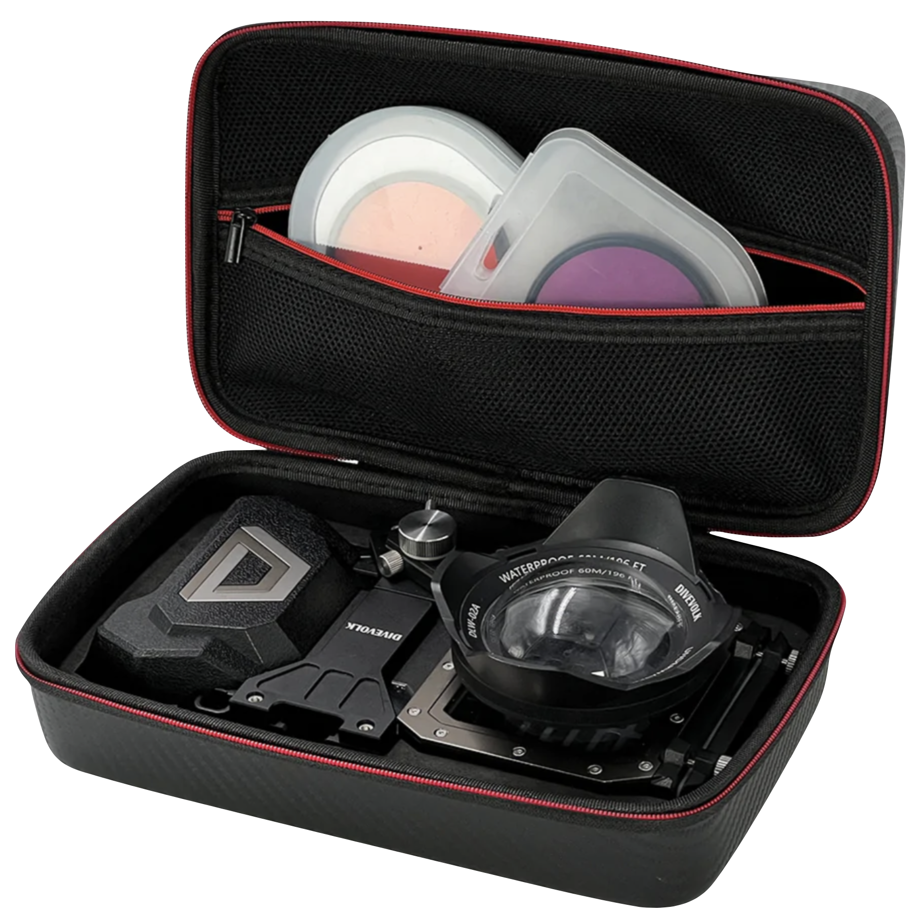 - 케이스 상부 - 지퍼가 달린 메쉬 원단에 의해 분리되어 있어 액세서리가 하우징에 충돌되지 않도록 보호