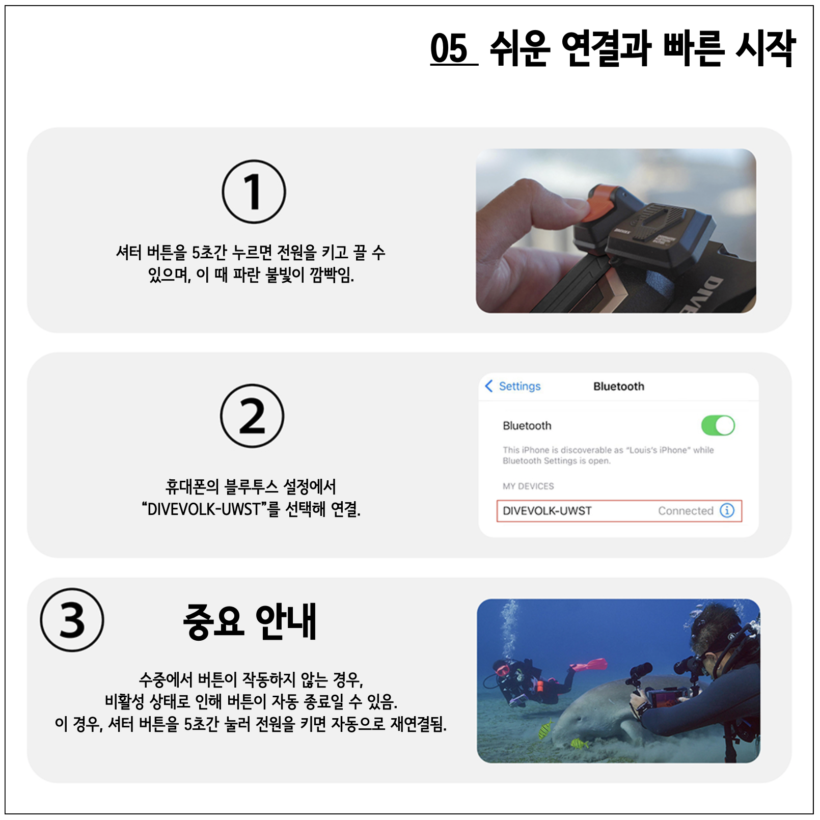 - 배터리 잔량 낭비를 줄이기 위해 수중에서는 "비행기 모드" 상태를 유지하시길 권합니다.