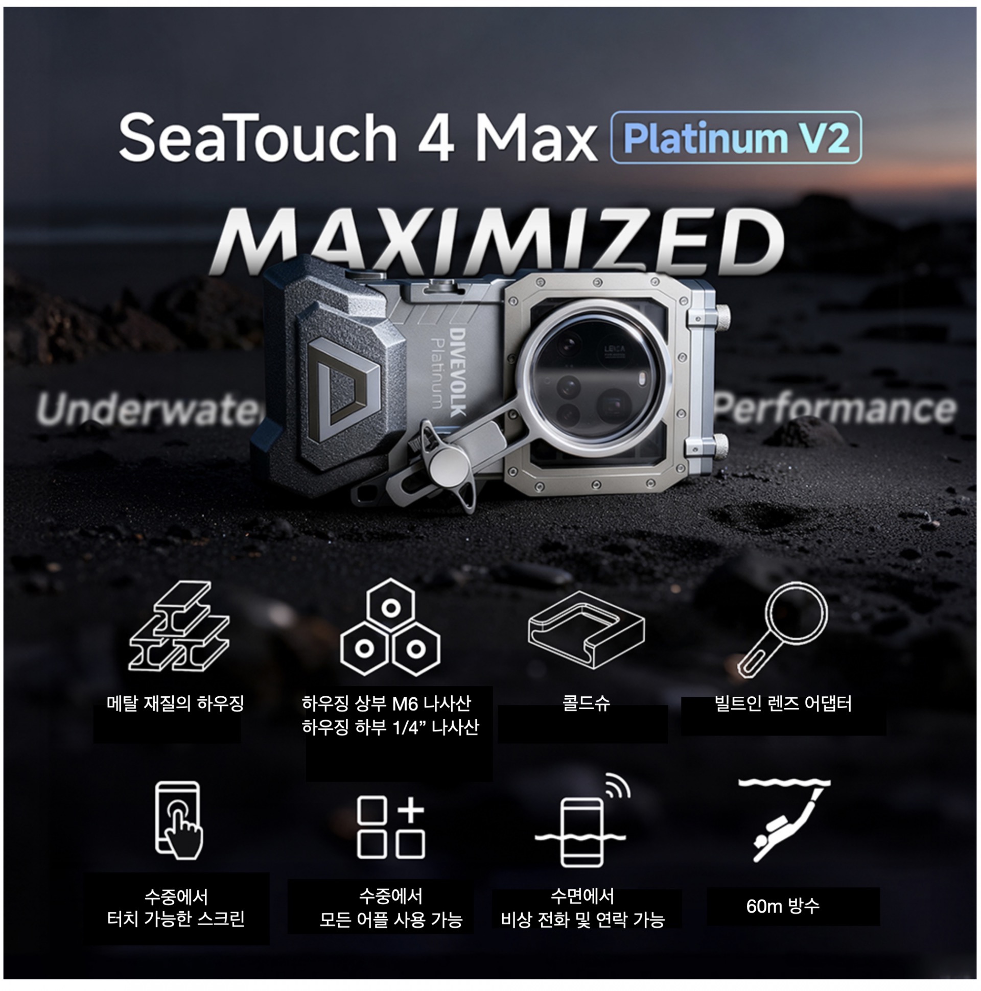 - 수중에선 4 MAX 시리즈 하우징 외부 정해진 자리에 장착해 사용 가능 (수중에선 단독으로 떨어져 사용 불가)