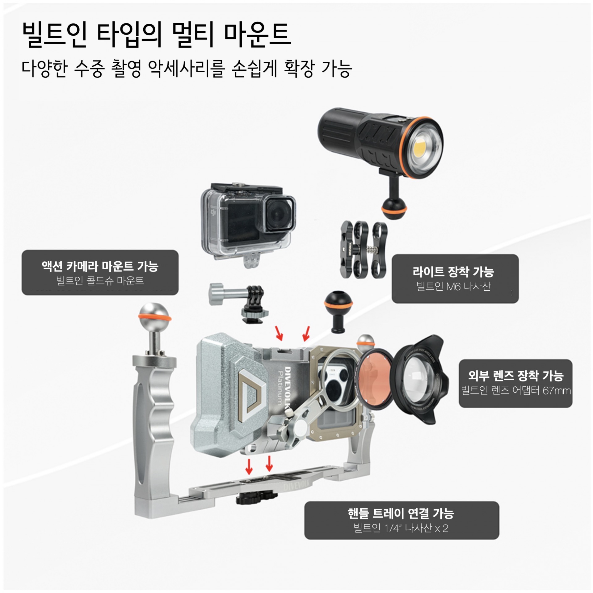 - 67m Lens Adaptor와 Expansion Clamp가 하우징 자체에 포함되어 있어, 광각 렌즈, 마크로 렌즈, 레드 필터, 트레이를 하우징에 직접 장착 가능