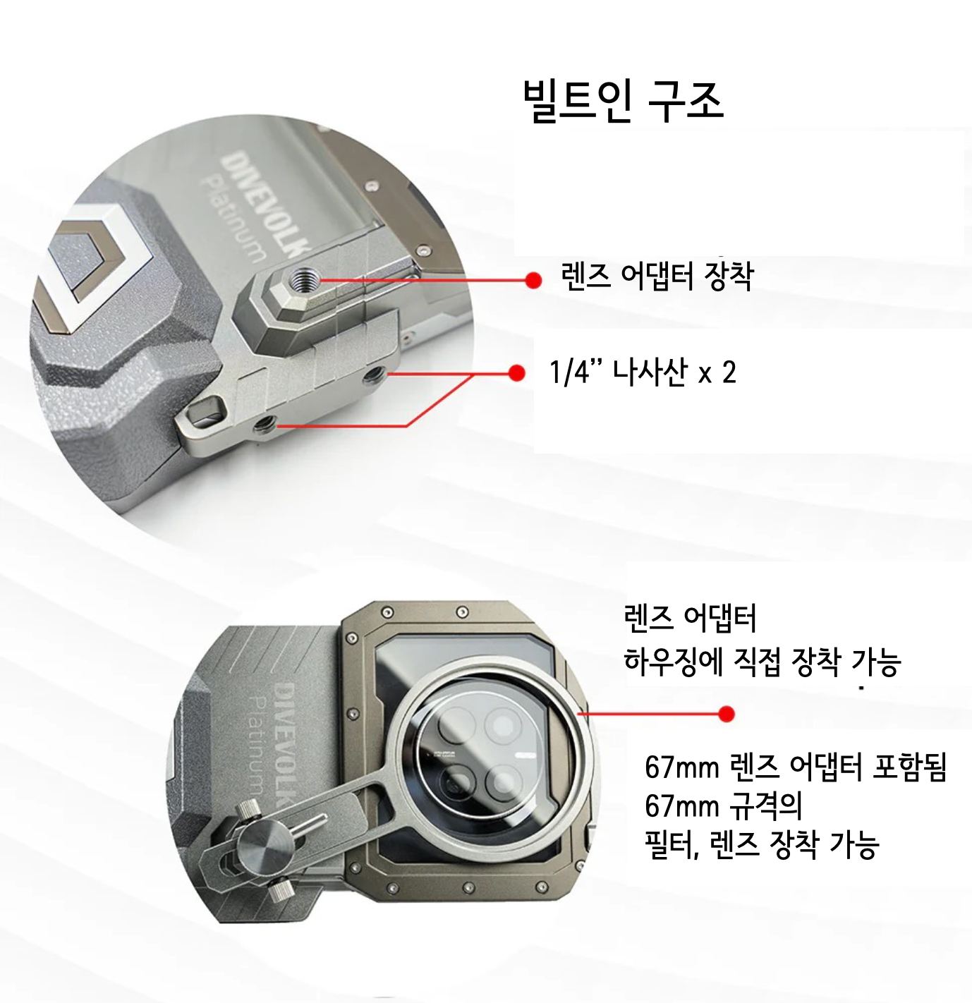 - 추가적인 촬영 장비 (마크로 렌즈, 와이드 렌즈, 레드 필터, 핸들 트레이, 트라이포트, 비디오 라이트 등) 부착 가능