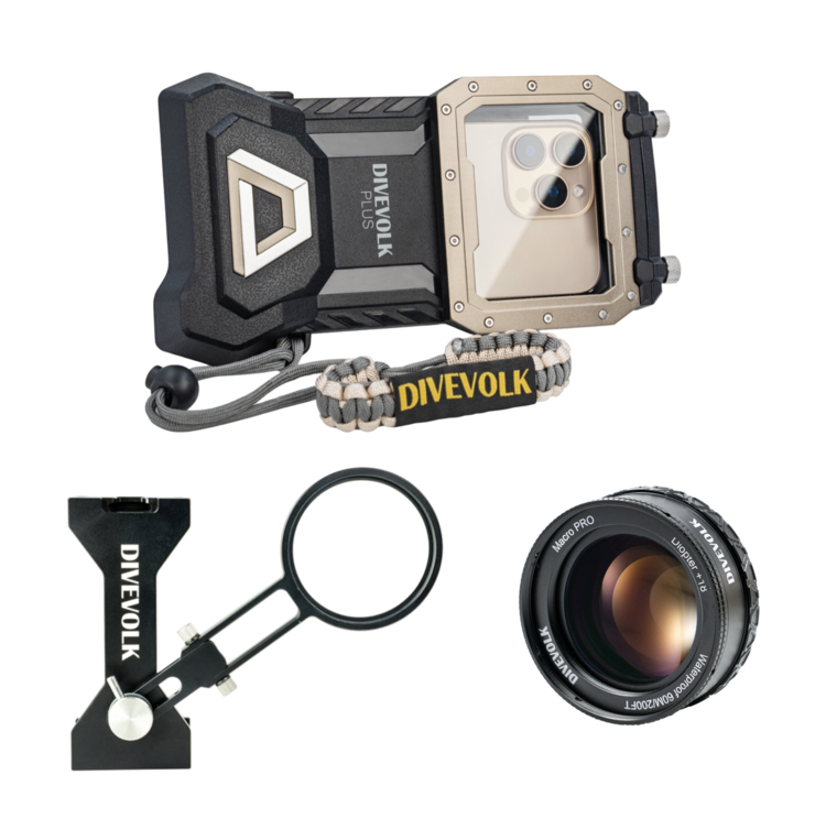 - DIVEVOLK 광각 렌즈, 마크로 렌즈, 레드 필터, 퍼플 필터 및 타사 전문가용 렌즈 장착 가능