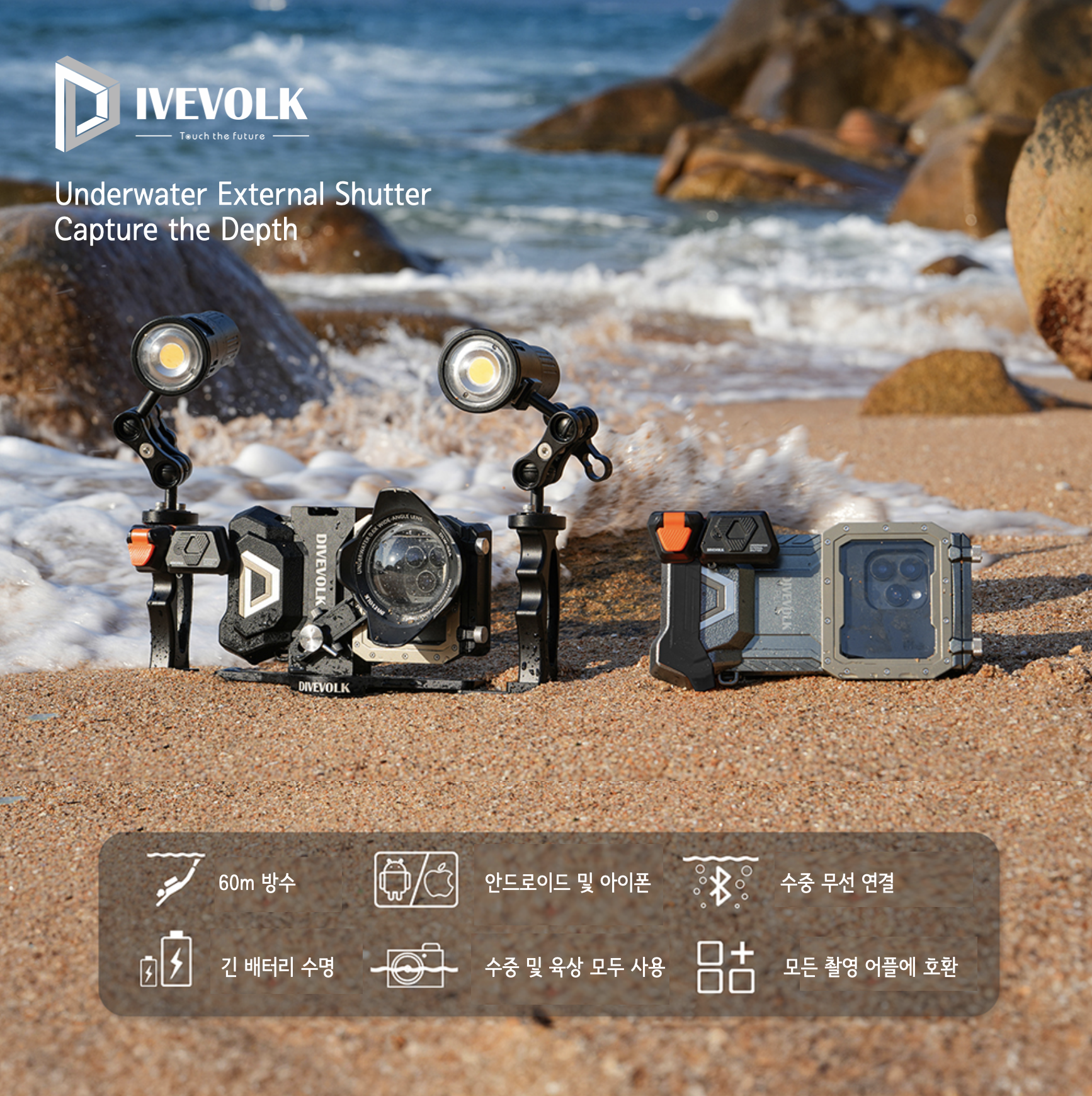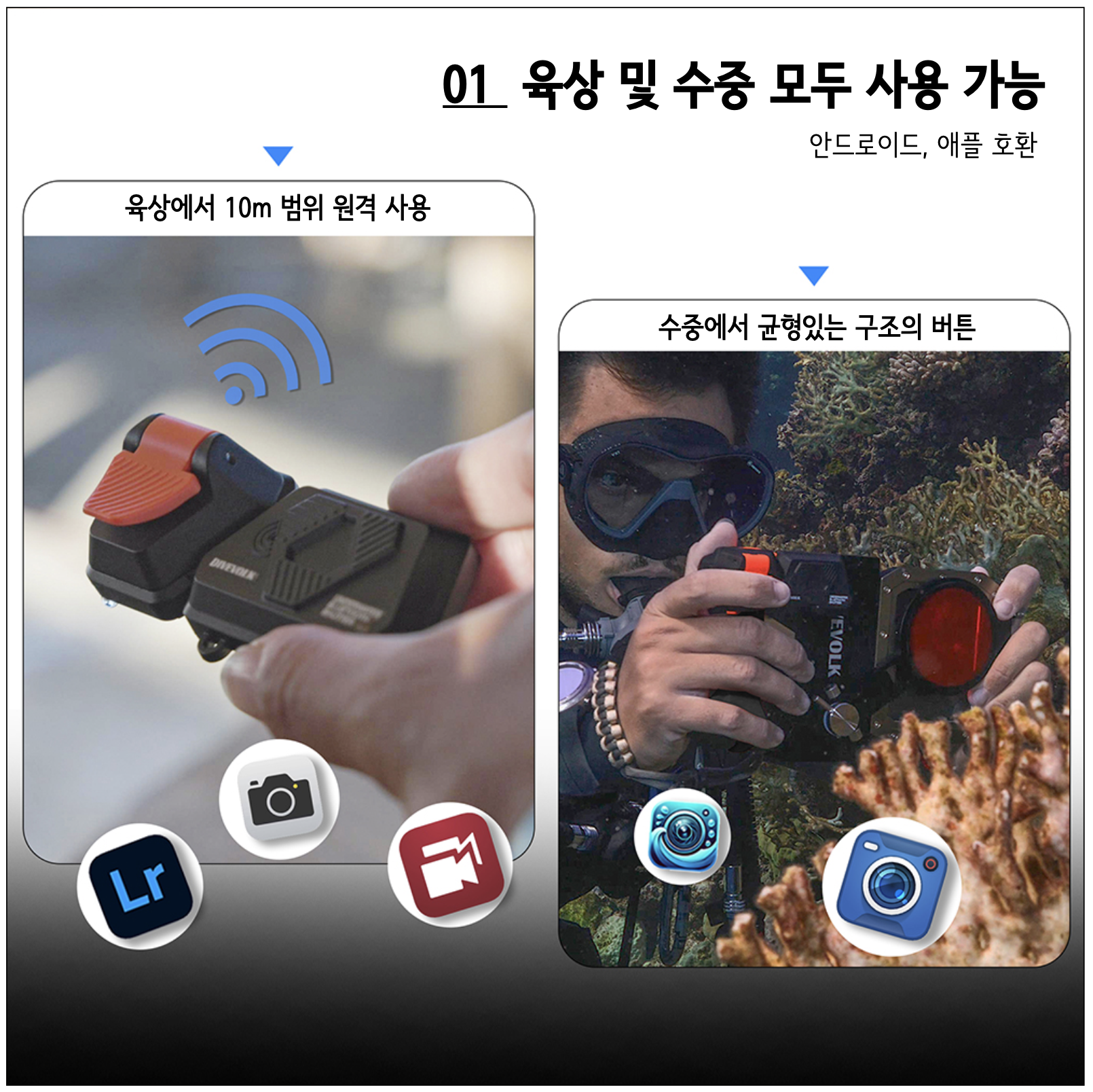 - 수중 카메라에 부착해 카메라 사진 촬영과 동시에 스마트폰으로 비디오 촬영 가능