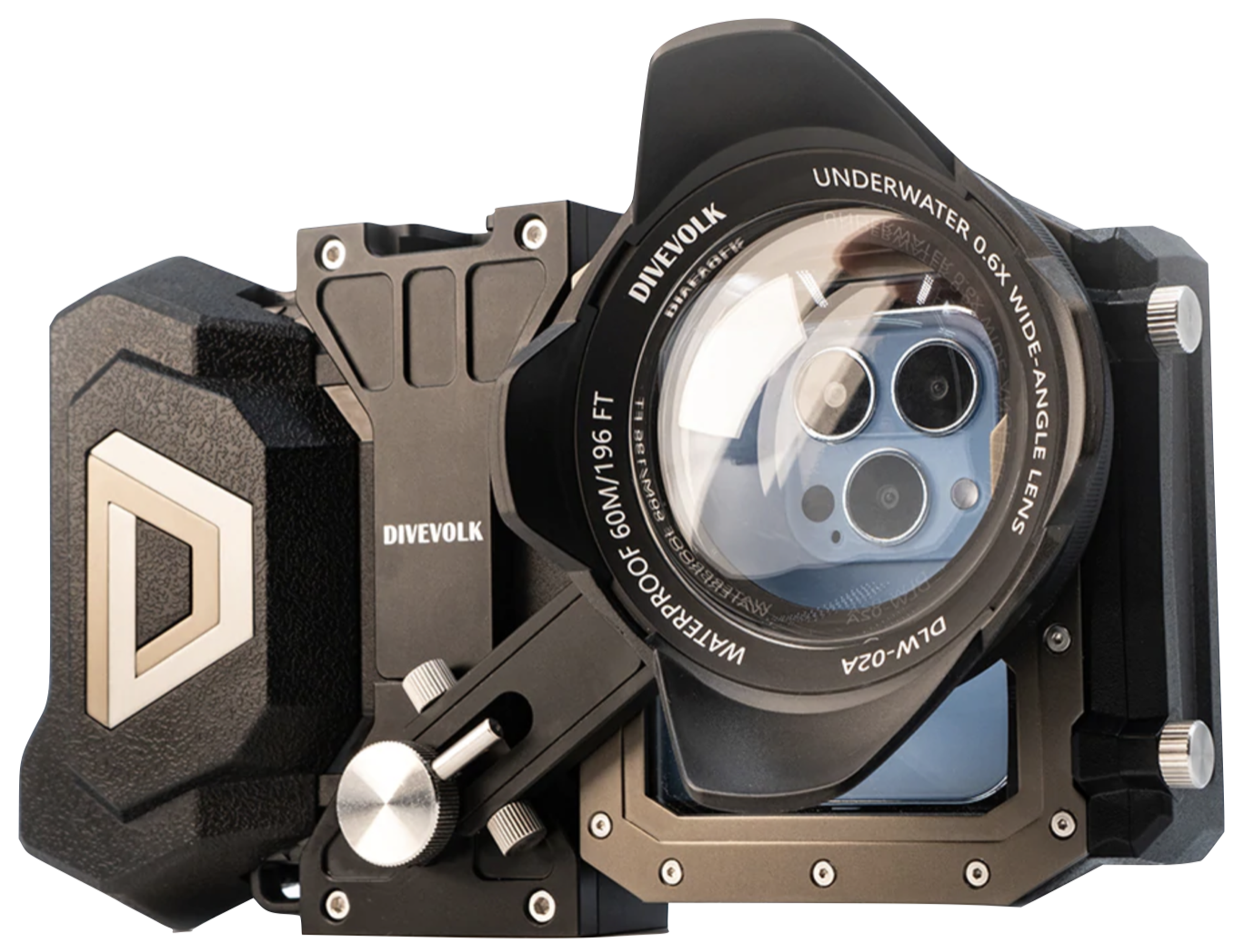 - DIVEVOLK 광각 렌즈, 마크로 렌즈, 레드 필터, 퍼플 필터 및 타사 전문가용 렌즈 장착 가능