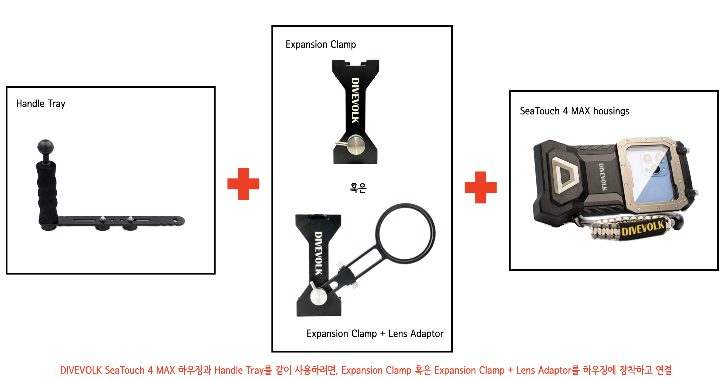 - DIVEVOLK 하우징과 같이 사용하기 위해선, 하우징에 Expansion Clamp를 장착해 연결해야 함 (하우징에 단독으로 직접 연결 불가)